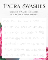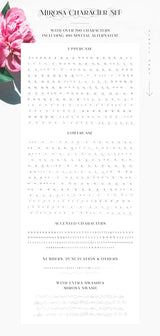 MIROSA is a modern elegant font typeface with beauty in every single letter. It contains bigger initial letters and a very huge character set with more than 400 alternates!! MIROSA allows you to create beautiful headlines, logos and titles in just minutes. But that’s not all! Additionally it comes with a second symbol font with 26 extra swashes. Furthermore I included a font guide to make sure you get the most out of this product.