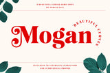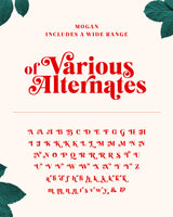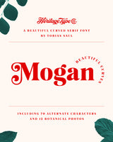 Mogan is an upper and lowercase serif font with nicely balanced curves. Like all of our fonts it is inspired by lettering from the good old past, but it still has a strong modern appearance. Its wide range of stylistic alternates allows versatile design options and works perfectly for headlines, logos, posters, packaging, T-shirts, postcards and much more. Furthermore we included a bonus of 12 leaf images, which we used for this presentation!