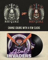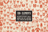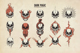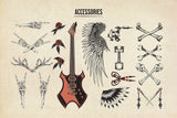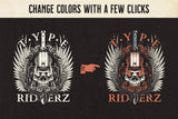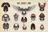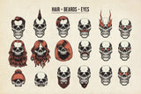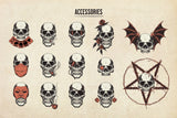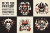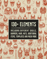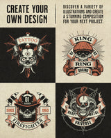 This interactive graphic set combines dozens of different skulls with hundreds of accessories, horns, weapons, and much more to set up stunning skull designs in no time. All elements are organized in a layer structure and available with a single click. This makes working with the skull creator super convenient. Banners in all kinds of shapes and styles allow you to quickly add text. Global colors in all elements let you change the color of your design easily. The all-in-one skull creator set is perfect for t-shirt, label, and poster design for projects about motorcycling, tattoo, biking, music, rockabilly, gaming, sports, and much more.