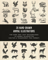• 20 Hand-drawn Animal Illustrations, Black (Ai, PDF, PNG, AFFINITY)