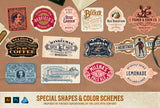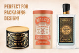 The Nostalgic Font and Label Collection works great for any kind of packaging design project, e.g. Food, Spirits, Beer, Cosmetics, Lemonades, Sweets, Playing Cards, Clothing and much more. All templates can easily be used by anyone working with Adobe Illustrator (CS4 or higher), Photoshop (CS4 or higher) or Affinity Designer.